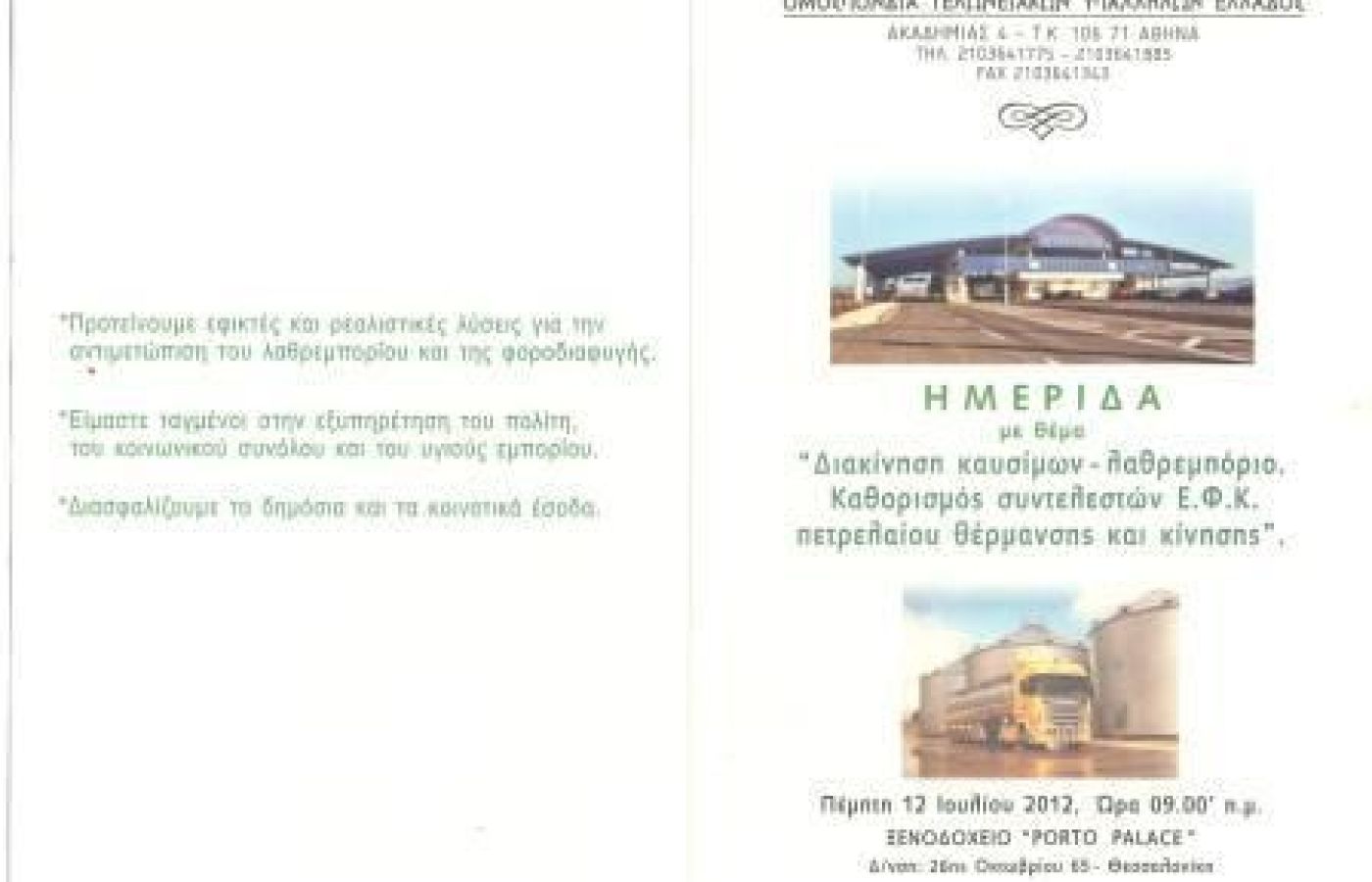 Ημερίδα με θέμα «Διακίνηση καυσίμων-λαθρεμπόριο-καθορισμός ΕΦΚ πετρελαίου θέρμανσης και κίνησης» πραγματοποιήθηκε την Πέμπτη 12 Ιουλίου στη Θεσσαλονίκη.