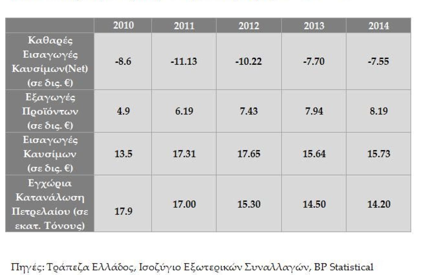 Μέχρι σήμερα η μείωση του λογαριασμού πετρελαιοειδών, δηλαδή του καθαρού κόστους εισαγωγών αργού για κάλυψη της εγχώριας ζήτησης, οφείλεται αποκλειστικά στην μείωση της κατανάλωσης κατά την περίοδο της τρέχουσας ύφεσης. Από 435,000 βαρέλια κατανάλωση την ημέρα που είχε σημειωθεί το 2007, σήμερα η χώρα δια της βίας καταναλώνει 280,000 βαρέλια, δηλαδή μια μείωση της τάξεως του 36%. Και ενώ για το 2015 δεν αναμένεται αισθητή μείωση στην κατανάλωση, εν τούτοις το κόστος εισαγωγής αργού για τοπική κατανάλωση αναμένεται να είναι μειωμένο σχεδόν κατά 45% σε σύγκριση με το 2014, λόγω της εντυπωσιακής υποχώρησης των διεθνών τιμών. Σύμφωνα με εκτιμήσεις παραγόντων της αγοράς ο πετρελαϊκός λογαριασμός για το 2015 πρόκειται να διαμορφωθεί κάτω από τα € 5 δις. με την κατανάλωση να παραμένει στα ίδια με πέρυσι επίπεδα.