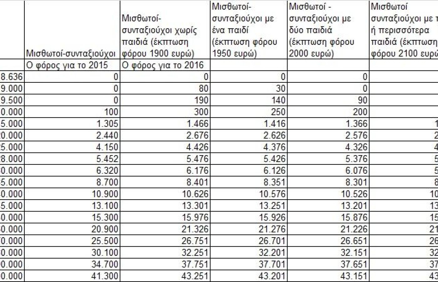 Για παράδειγμα σε μισθωτό με ένα παιδί και εισόδημα 17.000 ευρώ ο φόρος αυξάνεται από τα 1.759 ευρώ στα 1.900 ευρώ, ενώ στις 20.000 ευρώ εισοδήματος ο φόρος από τις 2.440 ευρώ αυξάνεται στις 2.626 ευρώ.