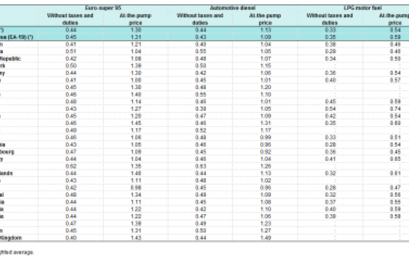 Όσον αφορά στο πετρέλαιο κίνησης, οι Έλληνες καταναλωτές κατέβαλαν το ποσό των 1,10 ευρώ το λίτρο κατά το εξεταζόμενο διάστημα, ενώ εξαιρουμένων φόρων και δασμών η εν λόγω τιμή διαμορφώνεται στα 0,55 ευρώ το λίτρο.