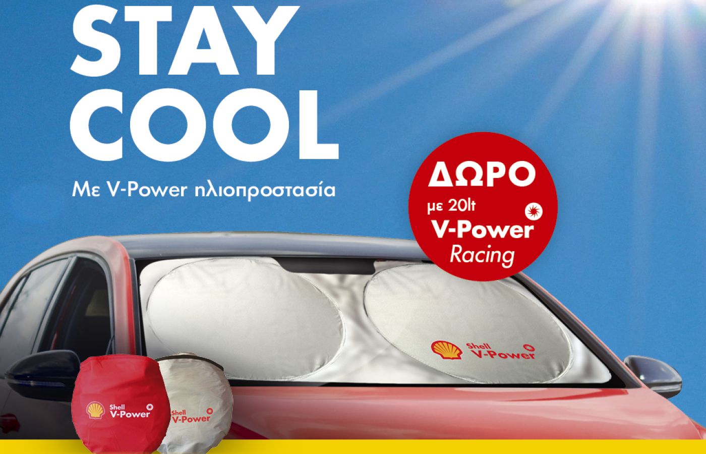 Η Shell φέτος το καλοκαίρι πάει κόντρα στις υψηλές θερμοκρασίες και με κάθε αγορά 20 λίτρων καυσίμων Shell V-Power, V-Power Diesel ή V-Power Racing, προσφέρει μία αναδιπλούμενη ηλιοπροστασία.