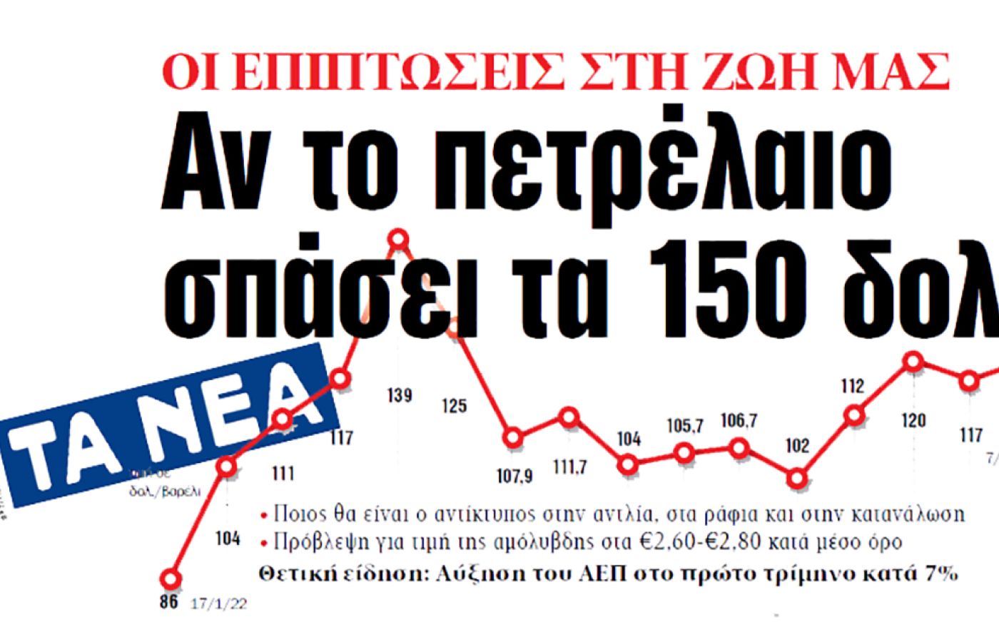Διαβάσαμε στην εφημερίδα «ΤΑ ΝΕΑ», σε ρεπορτάζ της Δήμητρας Σκούφου και του Χρήστου Κολώνα, μεταξύ άλλων, ότι το φράγμα των 120 δολαρίων το βαρέλι κατέρρευσε… και πλέον ο επόμενος πήχης είναι τα 150 δολάρια, με τους αναλυτές και τα στελέχη των εταιρειών εμπορίας πετρελαιοειδών να αδυνατούν να κάνουν προβλέψεις για τις επιπτώσεις στο σύνολο της οικονομίας.