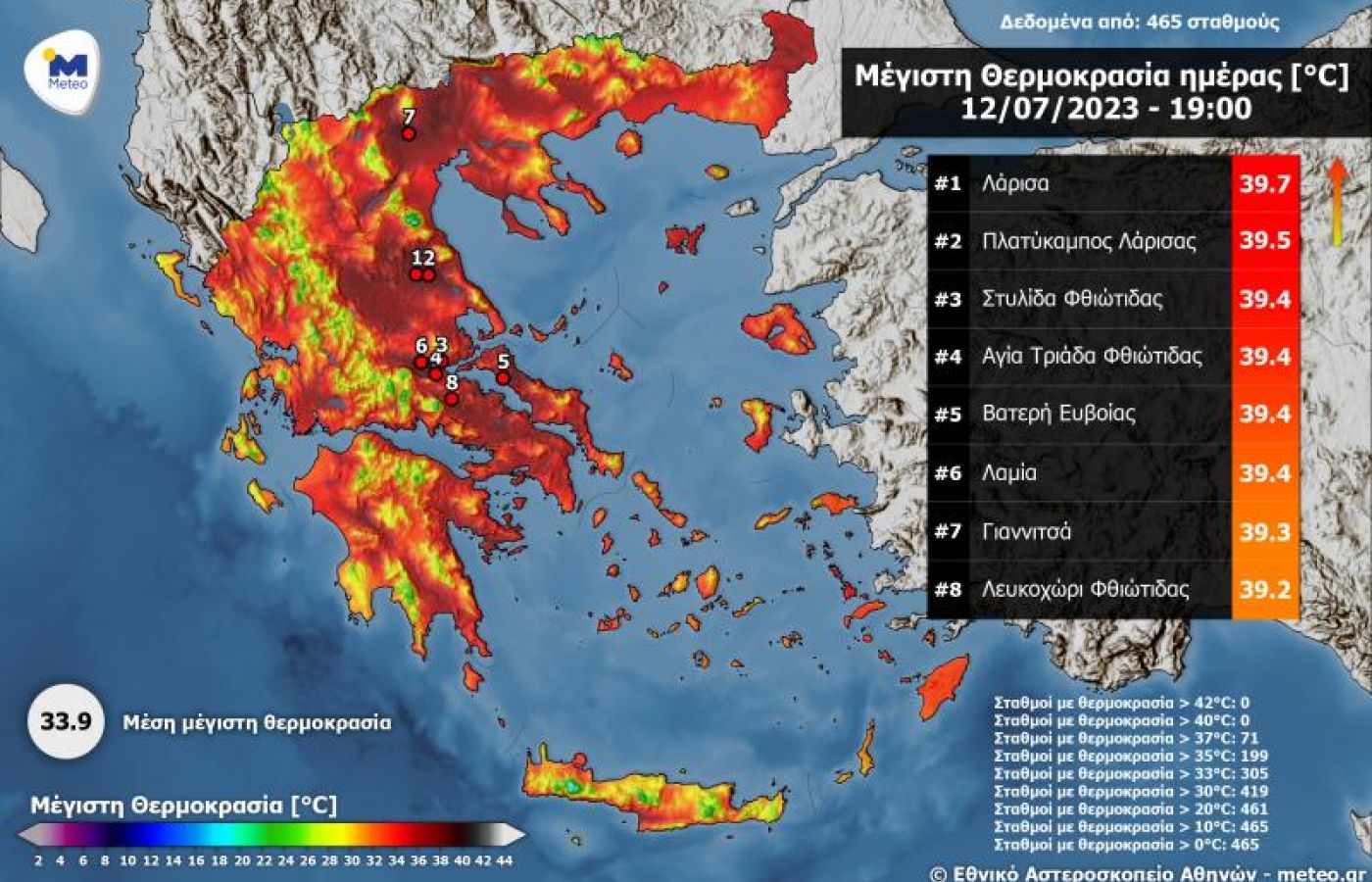 Σύμφωνα με το δίκτυο αυτόματων μετεωρολογικών σταθμών του Εθνικού Αστεροσκοπείου Αθηνών meteo.gr, ο υδράργυρος κινήθηκε σε πολύ υψηλά επίπεδα στη Λάρισα, ενώ ξεπέρασε τους 39 βαθμούς και σε Μακεδονία, Θεσσαλία, Στερεά Ελλάδα και Εύβοια.