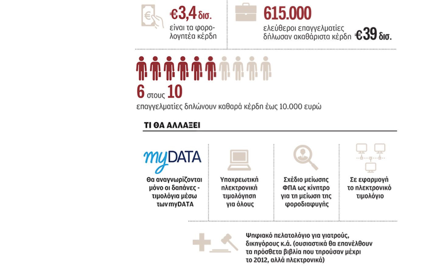 Οπως προαναφέρθηκε, οι επαγγελματίες δηλώνουν καθαρά κέρδη περίπου 4 δισ. ευρώ και ακαθάριστα σχεδόν τα δεκαπλάσια. Τα υπόλοιπα είναι δαπάνες. Αυτό σημαίνει ότι διογκώνουν τις δαπάνες. Για τον καλύτερο έλεγχο των δαπανών σχεδιάζεται να αναγνωρίζονται μόνο οι δαπάνες που περνούν μέσα από τα ηλεκτρονικά βιβλία MyDATA. Δηλαδή όλες οι δαπάνες ενός ελεύθερου επαγγελματία είτε εκπίπτει ο ΦΠΑ είτε μόνο μειώνει το φορολογητέο εισόδημα θα πρέπει να γίνονται μέσω των ηλεκτρονικών βιβλίων.