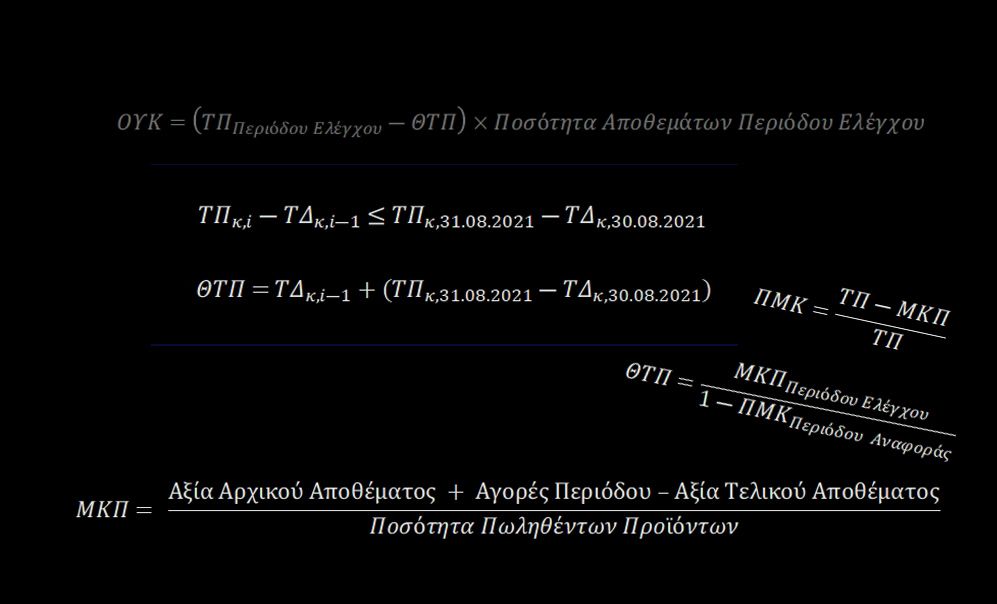 7. Όφελος Υπέρ του Κανονικού (ΟΥΚ): Το γινόμενο της διαφοράς της πραγματικής Τιμής Πώλησης ανά μονάδα Προϊόντος της Περιόδου Ελέγχου από τη Θεωρητική Τιμή Πώλησης επί το σύνολο της ποσότητας των αποθεμάτων του Προϊόντος (πωληθέντων και μη) κατά την Περίοδο Ελέγχου, σύμφωνα με τον τύπο: