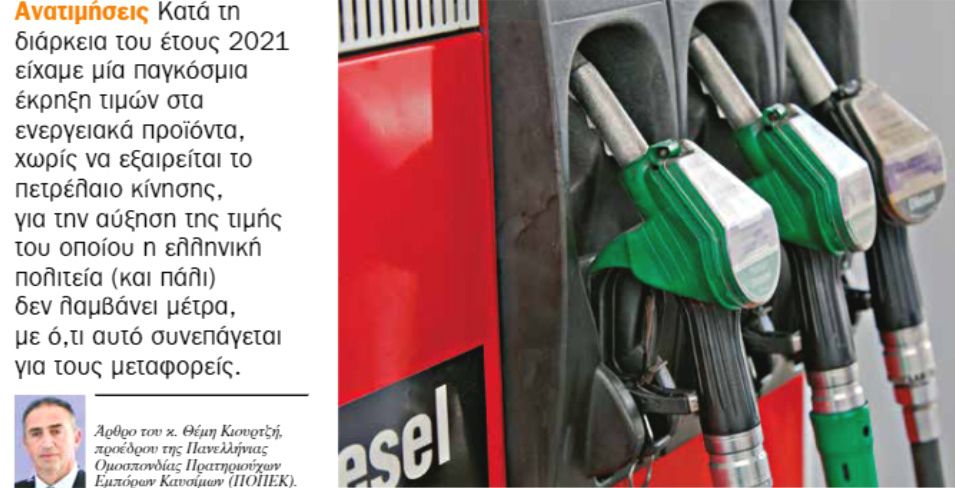 Από τα ρεζερβουάρ των οδηγών, η φωτιά στα καύσιμα καίει και την εφοδιαστική αλυσίδα, προκαλώντας αλυσιδωτές αυξήσεις στις τιμές των εγχώρια διακινούμενων αγαθών, αλλά και των υπηρεσιών, φουντώνοντας κι άλλο τον ήδη τσουχτερό «εισαγόμενο» πληθωρισμό, τονίζει, μεταξύ άλλων, σε επιστολή της προς τον υπουργό Οικονομικών Χρήστο Σταϊκούρα η Πανελλήνια Ομοσπονδία Πρατηριούχων Εμπόρων Καυσίμων (ΠΟΠΕΚ), ζητώντας άλλη μια φορά τη μείωση του Ειδικού Φόρου Καυσίμων ως «πιο επιτακτική από ποτέ».